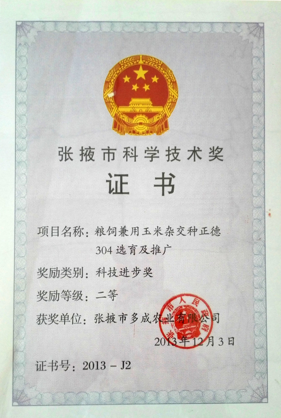 | 糧飼兼用玉米雜交種正德304選育及推廣——張掖市科學(xué)技術(shù)進步獎二等獎 | ||